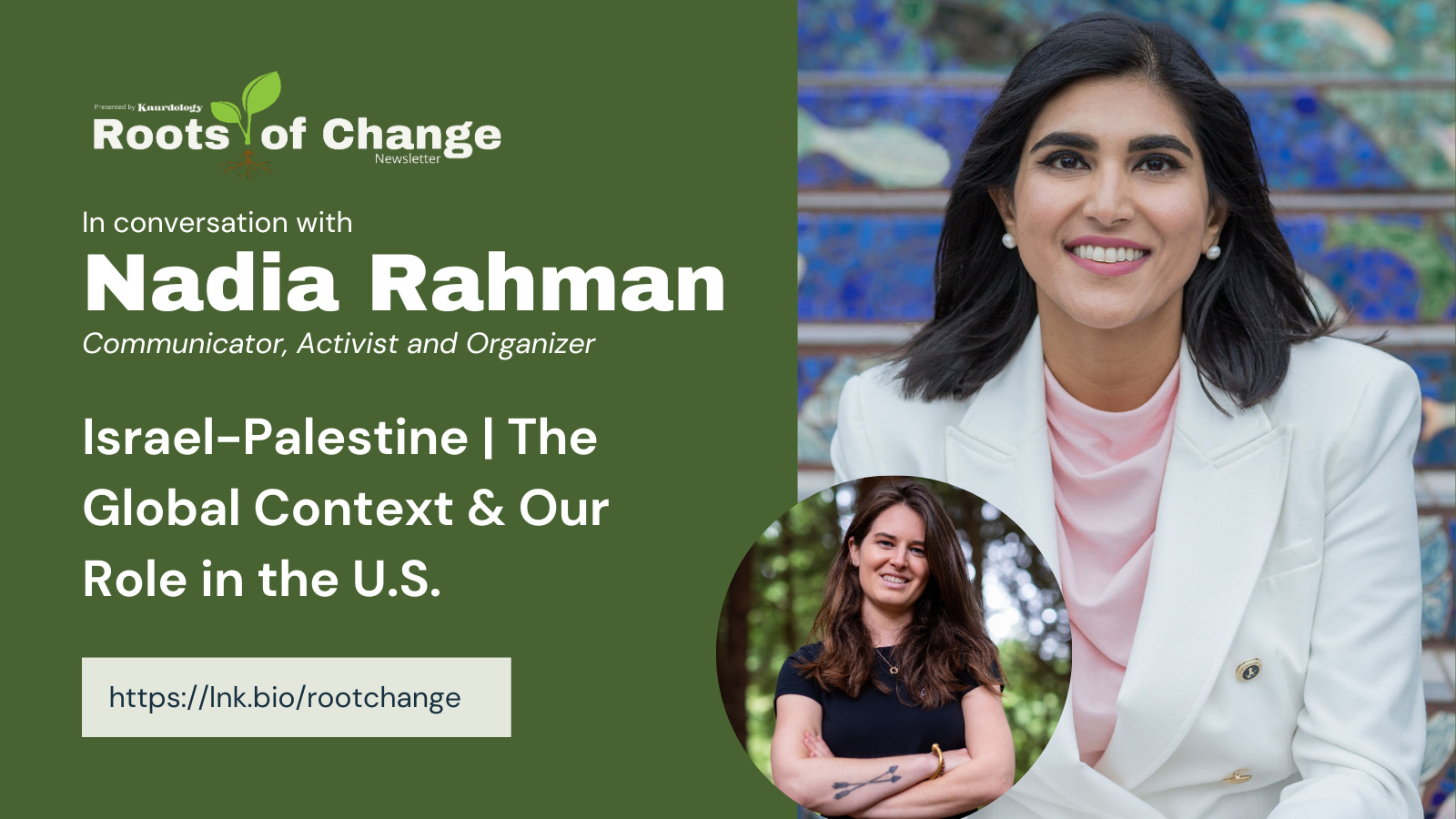 Hey y'all, welcome back. This is Sam Chavez with the Roots of Change newsletter and podcast and I am here with Nadia Rahman. She is a skilled communicator activist and organizer. She has 17 years of experience in digital marketing and strategy spanning pretty much anything you could possibly imagine within those two realms. And she's done that across a lot of different organizations. She has worked in advocacy and community relations. She has run her own political campaign, among many other things. So welcome, Nadia. I'm really excited to have you here and talking about this topic today.